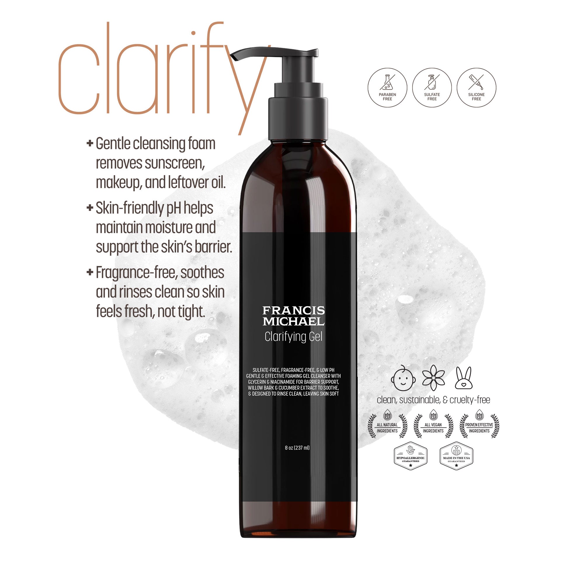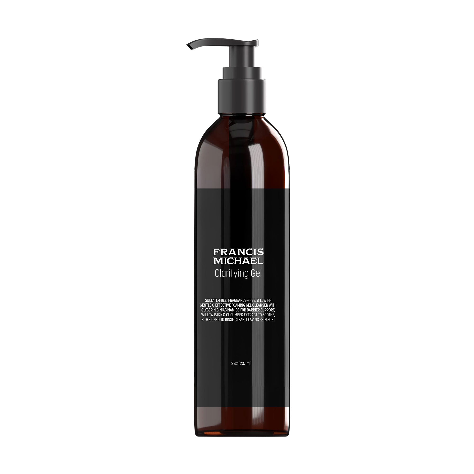 GENTLE AND EFFECTIVE, this cleanser is sulfate-free, fragrance-free, and has a low pH. It effectively removes SPF, makeup, excess oil, and daily impurities without stripping the skin's natural moisture. The mild surfactant blend produces a soft, cushiony lather that protects the skin’s acid mantle. Glycerin and niacinamide help support the moisture barrier, promoting a balanced and healthy appearance. Additionally, urea and Schizophyllan enhance hydration and comfort, while willow bark and cucumber soothe the skin and refine the appearance of pores, leaving the complexion calm and clarified. The formula is finished with glyceryl oleate and vitamin E, providing a clean, silky finish that leaves the skin feeling soft, fresh, and never tight. Balanced at a skin-friendly pH, this soap-free formula utilizes biodegradable glucoside and taurinate surfactants, resulting in a quick, cushiony lather that rinses clean with no residue left behind. It is free from essential oils and dyes, making it suitable for sensitive skin. Additionally, it is made without silicones, mineral oil, or parabens. It pairs seamlessly with FRANCIS MICHAEL Cleansing Oil for a balanced double cleanse. Net Wt 2 oz (57 g) Net Wt 2 oz (57 g)